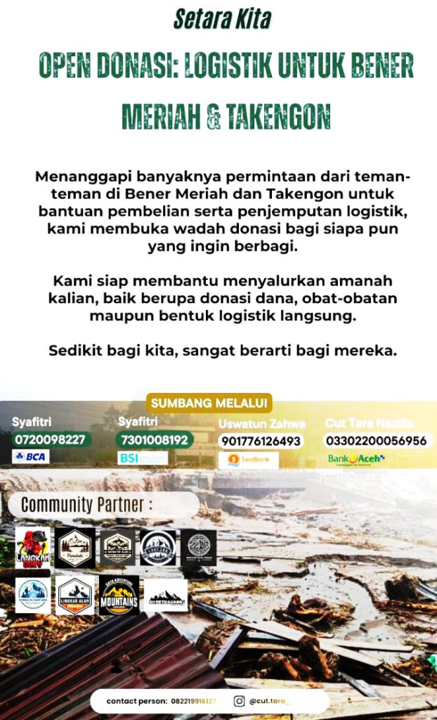 ASPOST.ID- Menanggapi meningkatnya kebutuhan bantuan di wilayah Bener Meriah dan Takengon, Setara Kita secara resmi membuka penggalangan donasi logistik untuk mendukung proses pemulihan masyarakat terdampak.