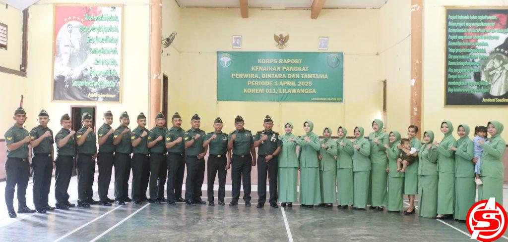 “Periode 1 April 2025 ini sebanyak 18 prajurit Korem 011/Lilawangsa menerima kenaikan pangkat lebih tinggi dari pangkat semula, yaitu 2 Perwira dari Letda ke Lettu, 12 Bintara bervariasi, dari Serda sampai ke Serma, dan 4 Tamtama dari Pratu sampai Kopda,” urai Danrem.