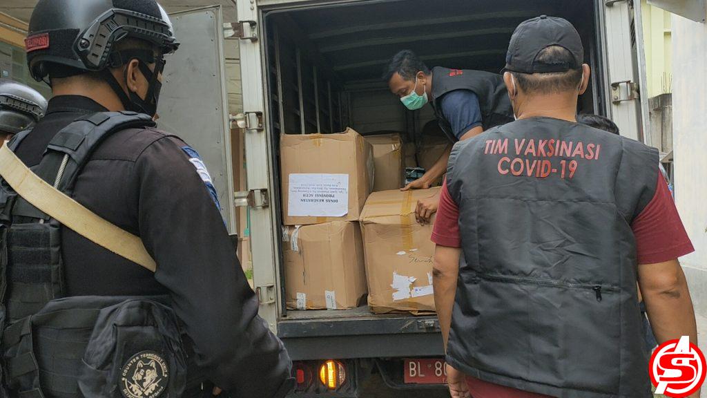 Selama perjalanan dari Banda Aceh menuju Kota Lhokseumawe, kendaraan yang membawa vaksin Covid-19 dikawal konvoi voorijder Kepolisian yang bersenjata lengkap.