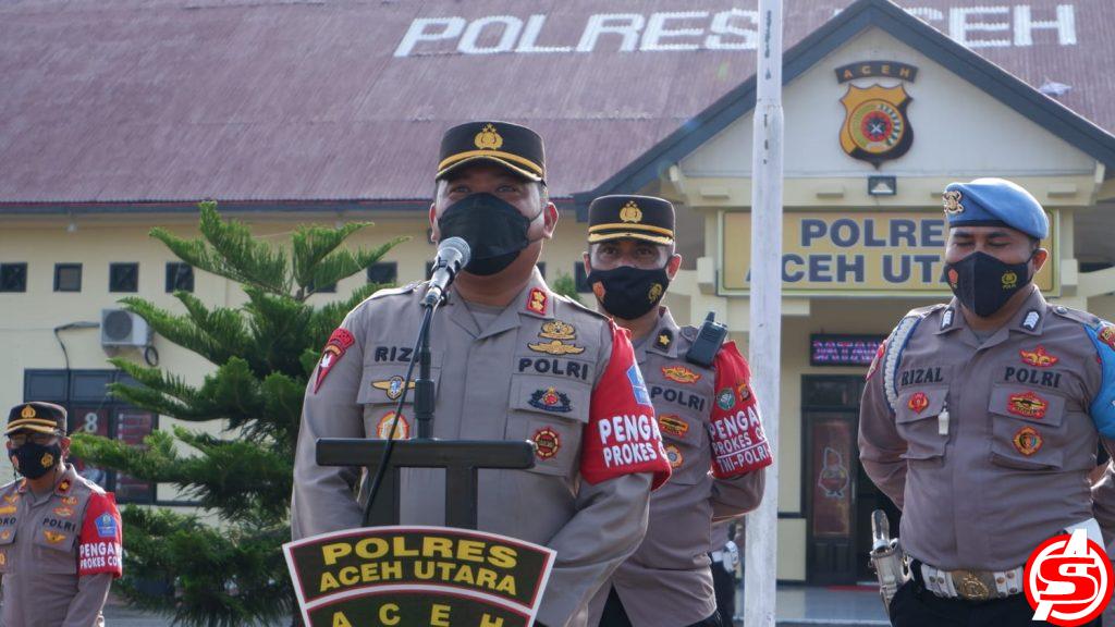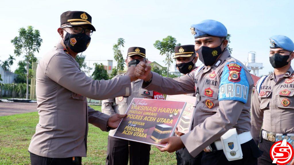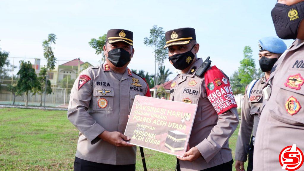 ASPOST.ID – Kapolres Aceh Utara AKBP Riza Faisal, S.I.K., M.M., memberikan hadiah tiket Umrah kepada 2 personil yang diundi