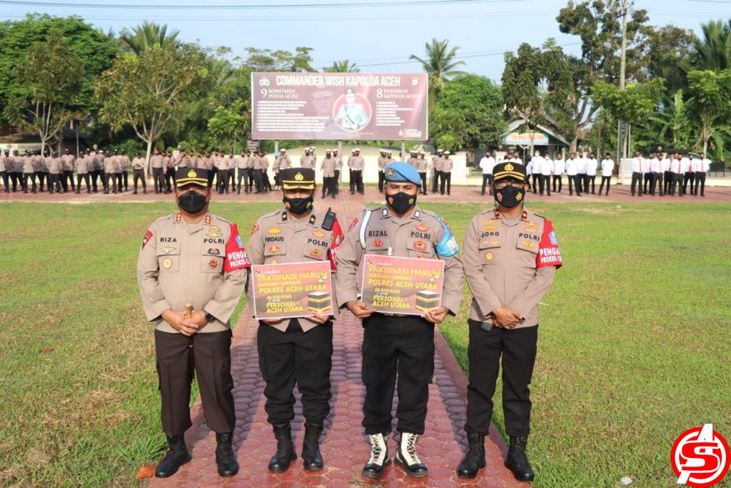 di Lapangan Apel Tribrata Mapolres Setempat, Senin (31/01/2022). Hadiah itu diberikan sebagai bentuk apresiasi Kapolres Aceh Utara, kepada personilnya yang telah bekerja dalam mendongkrak capaian vaksinasi hingga memenuhi target di akhir Januari 2022, yakni mencapai 75 persen.