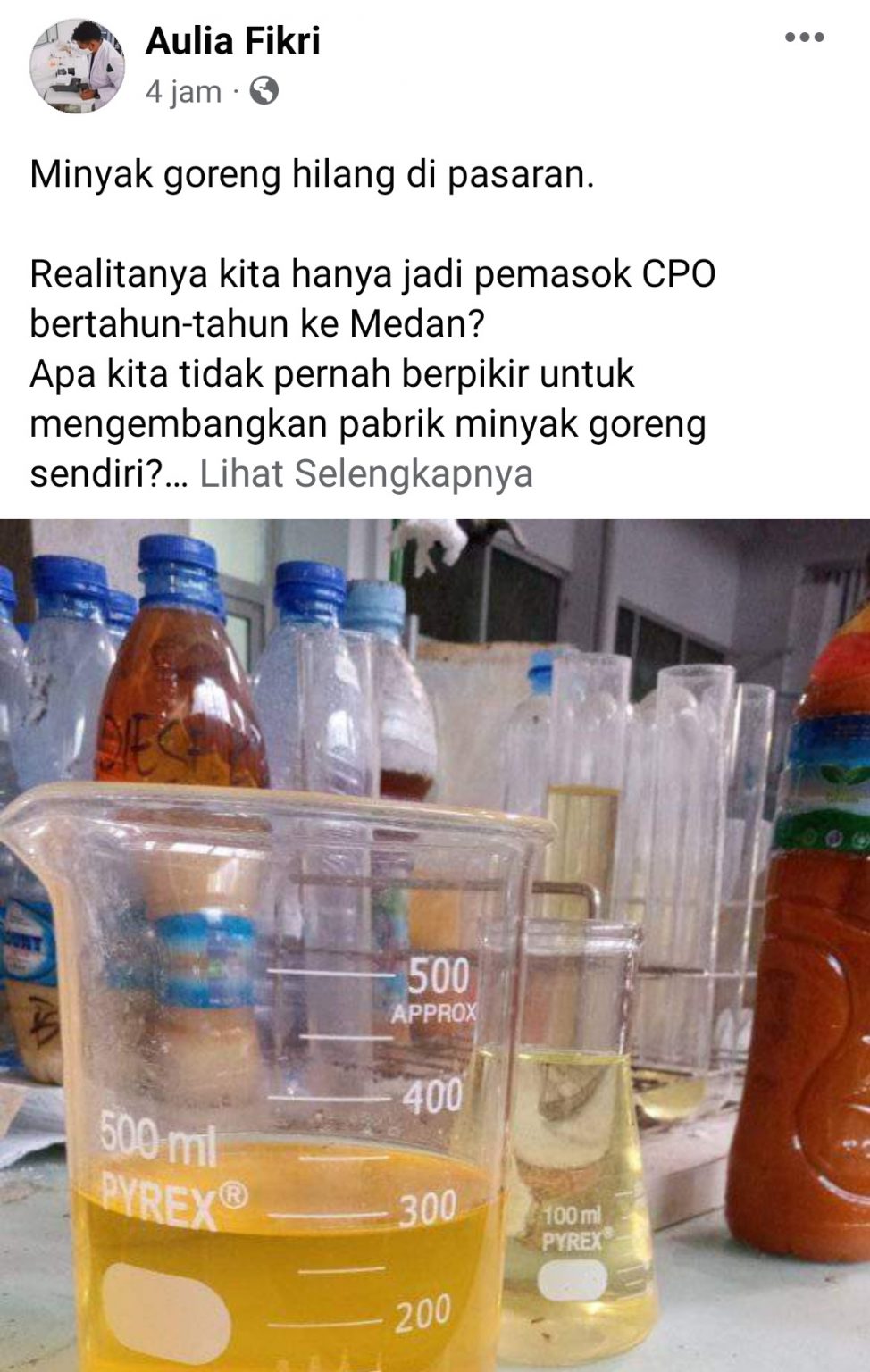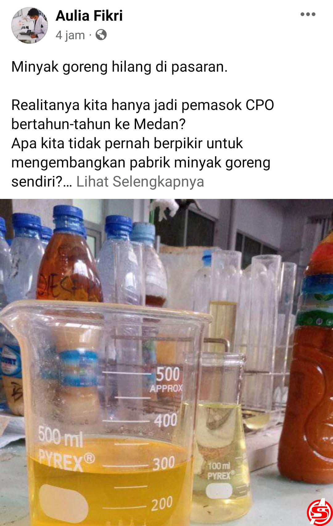 Demikian salah satu postingan warnet di media sosial Facebook Aulia Fikri pada Senin (14/2/2022). Ia juga menuliskan, sekedar membagi ilmu, harusnya Pemerintah Aceh datang sesekali ke Politeknik Negeri Lhokseumawe. Tepatnya di Jurusan Teknik Kimia, lebih detailnya lagi di laboratorium Pilot Plant & Teaching Factory. Lihat bagaimana mahasiswa/i mengolah CPO menjadi minyak curah sekelas minyak goreng bermerek lainnya.