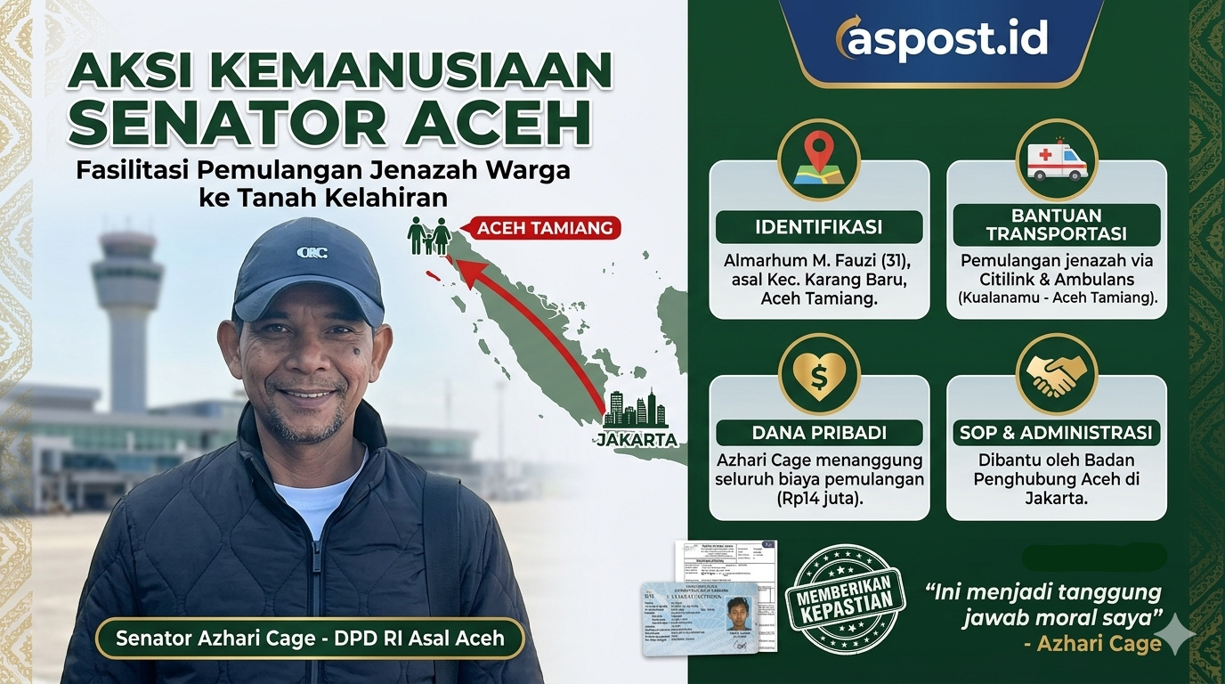 ASPOST.ID- Anggota Dewan Perwakilan Daerah (DPD) RI asal Aceh, Azhari Cage, kembali menunjukkan komitmennya dalam aksi kemanusiaan dengan memfasilitasi pemulangan jenazah warga Aceh dari perantauan ke kampung halaman.
