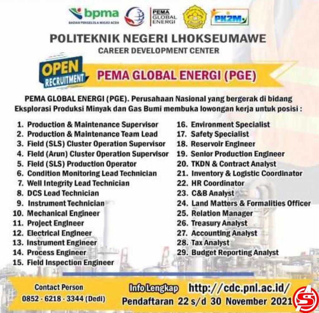 ASPOST.ID- Pema Global Energi (PGE) merupakan perusahaan nasional yang bergerak di bidang eksplorasi – produksi minyak dan Gas Bumi di Aceh Utara membuka lowongan kerja dan segera daftarkan diri. (asp)
