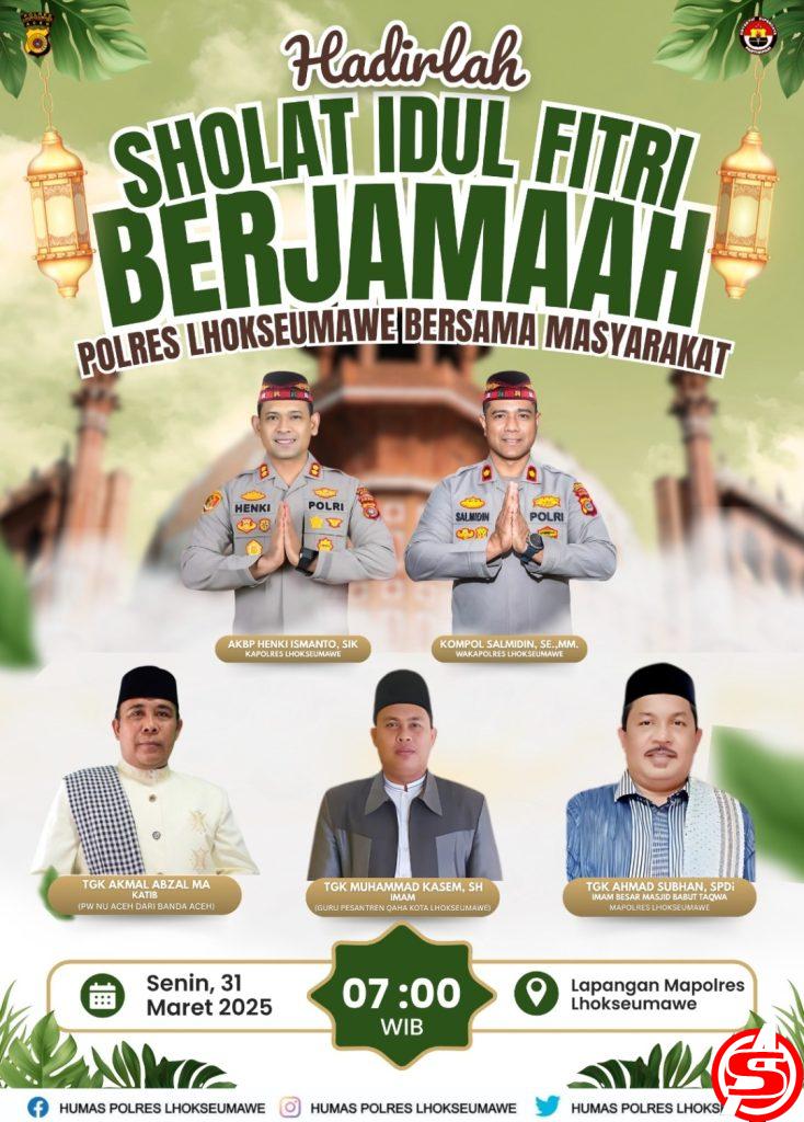 ASPOST.ID- Polres Lhokseumawe mengajak kepada seluruh masyarakat di lingkungan Polres Lhokseumawe di kawasan Meunasah Masjid, Kecamatan Muara Dua, untuk ikut serta dalam pelaksanaan ibadah shalat Idul Fitri 1446 Hijriah, pada Senin besok, 31 Maret 2025, sekira pukul 07.00 WIB.