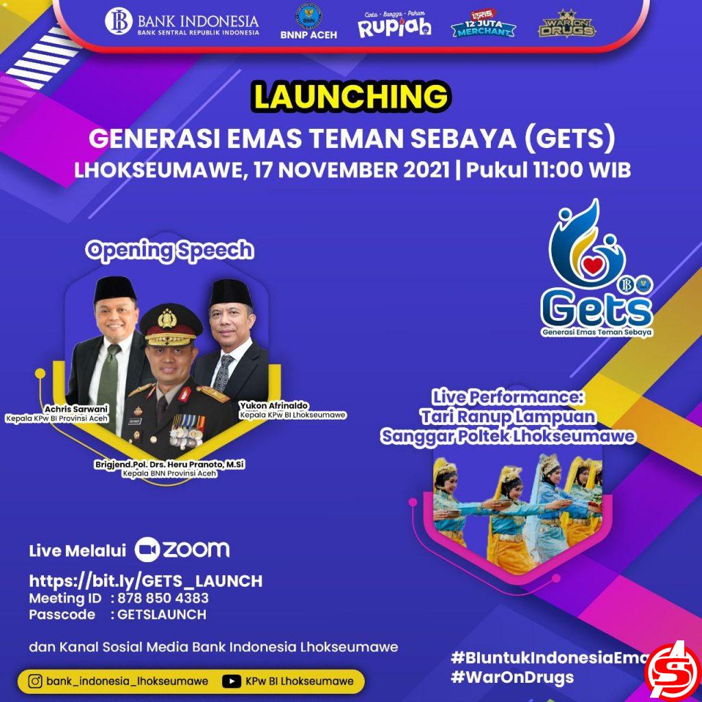 Dalam rangka upaya untuk mendukung Program P4GN, KPwBI Lhokseumawe berkolaborasi dengan BNN Provinsi Aceh dan BNN Kota Lhokseumawe untuk melakukan kegiatan pemberdayaan masyarakat melalui wadah Generasi Emas Teman Sebaya (GETS). GETS bertujuan untuk memberdayakan pelajar melalui sosialisasi/edukasi dan capacity building agar dapat berperan aktif dalam rangka pencegahan, pemberantasan penyalahgunaan dan peredaran gelap narkotika dan sebagai agen untuk diseminasi wawasan terkait Program Bank Indonesia.