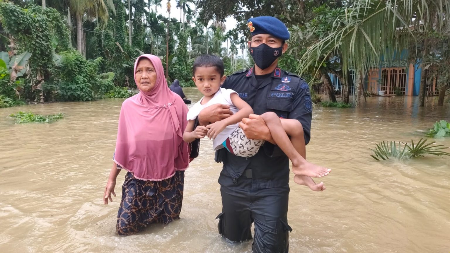 ASPOST.ID- Satuan Brimob Polda Aceh dari Kompi 4 Batalyon B Pelopor mengerahkan sejumlah personil untuk mengevakuasi warga yang terjebak musibah bencana banjir di Kecamatan Pirak Timur dan Matangkuli, Aceh Utara, pada Ahad (2/1/2022).