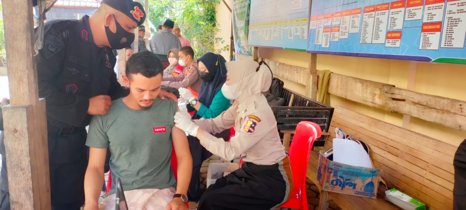 ASPOST.ID- Satuan Brimob Polda Aceh dari Kompi 4 Batalyon B Pelopor bersama tim vaksinator Mabes Polri dan tim Dokkes Polda Aceh membuka gerai vaksinasi massal di Dayah Babussalam Al Hanafiah Gampong Keude Matangkuli, Kecamatan Matangkuli Aceh Utara, Sabtu (25/12).
