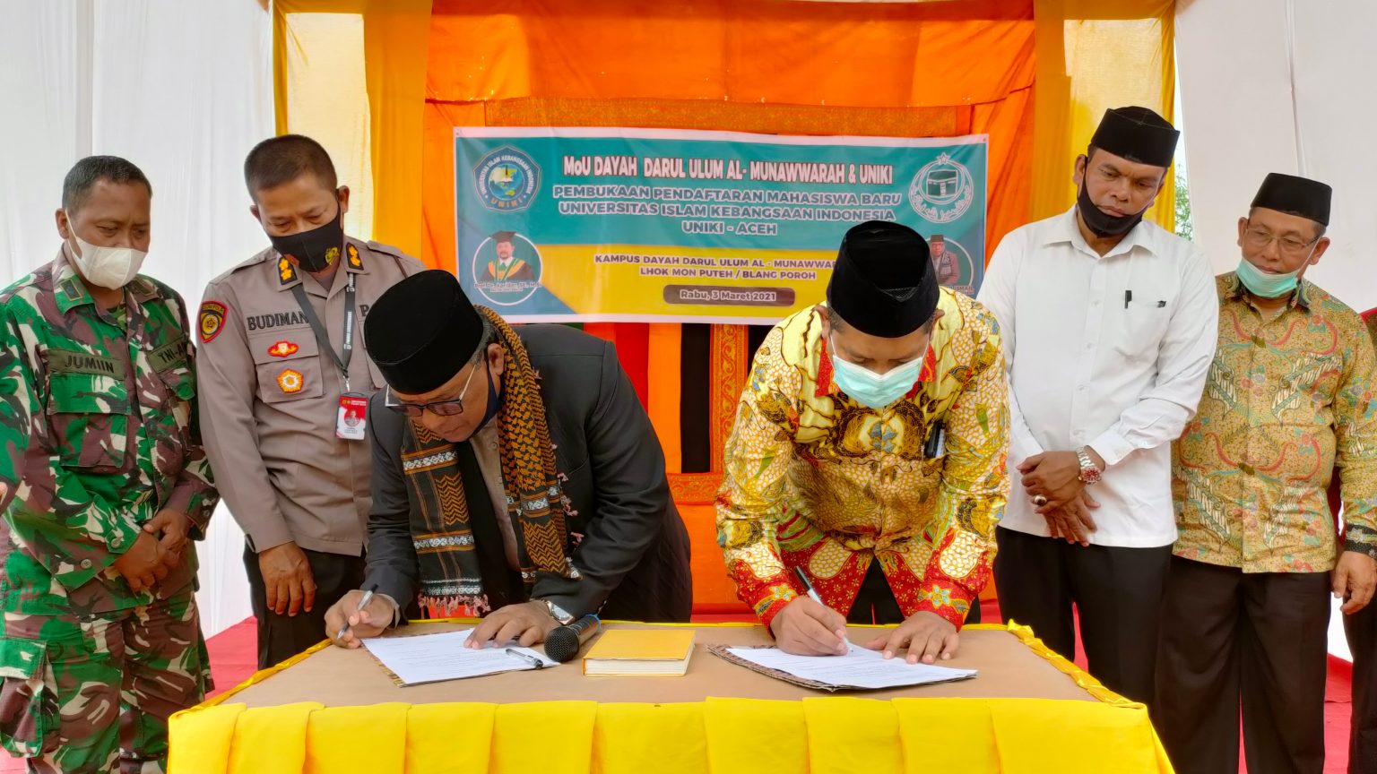 MoU itu diteken oleh Rektor UNIKI Prof. Dr. Apridar, SE.,M.Si, sebagai pihak pertama dan Pimpinan Dayah Darul Ulum Al-Munawwarah, Tgk. H. Abubakar Ismail (Abati) sebagai pihak kedua.