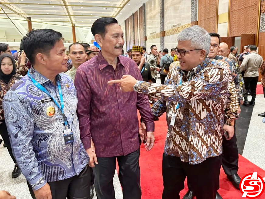 Pj Gubernur Aceh, Bustami Hamzah sedang berbincang dengan Menteri Koordinator Bidang Kemaritiman dan Investasi (Menko Marves) Luhut B. Pandjaitan dan pejabat lainnya disela-sela mengikuti Musrenbangnas di Balai Sidang Jakarta Convensional Center (JCC), Jakarta, Senin 6 Mei 2024.