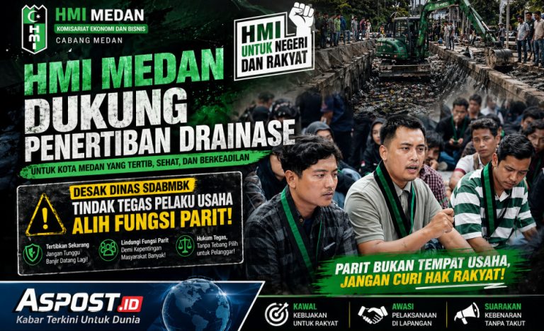 ASPOST.ID- Himpunan Mahasiswa Islam (HMI) Cabang Medan menegaskan dukungan penuh terhadap langkah tegas Pemerintah Kota Medan melalui Kepala Dinas Sumber Daya Air, Bina Marga, dan Bina Konstruksi (SDABMBK) Khairul Azmi, dalam menertibkan pelaku usaha yang mengalihfungsikan parit atau saluran drainase menjadi area parkir dan kepentingan komersial lainnya.