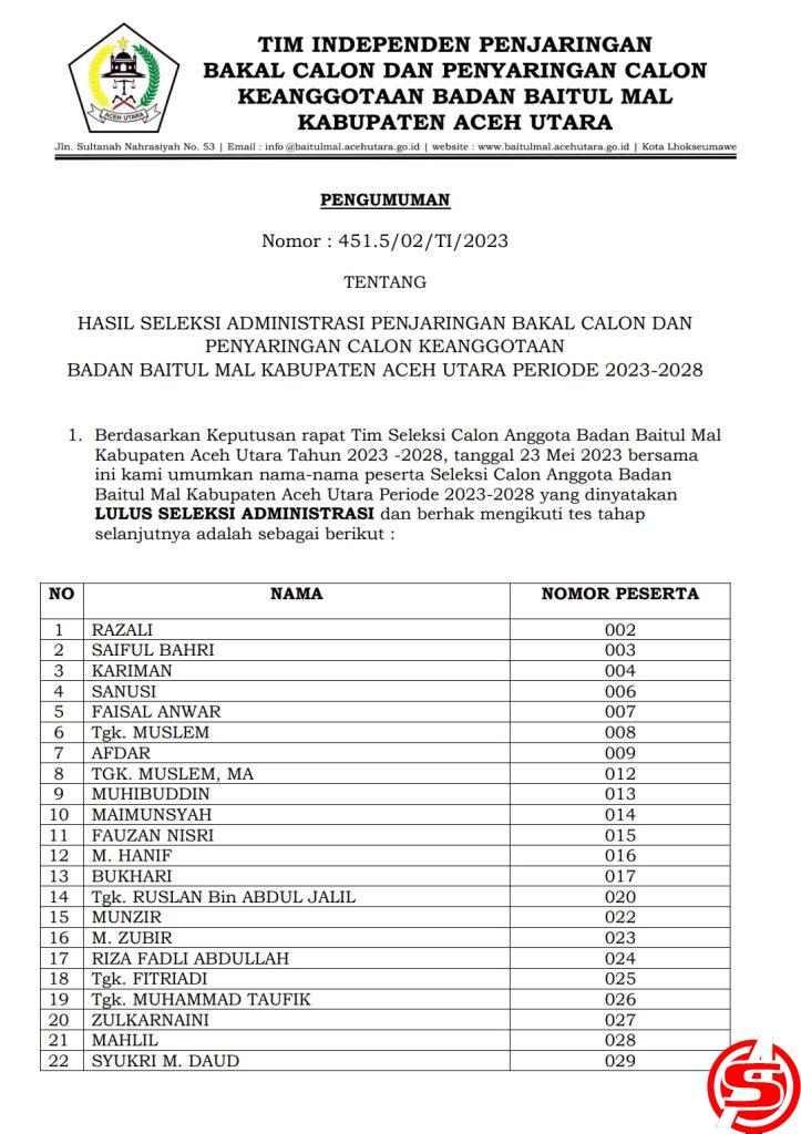 Hal itu sesuai dengan Keputusan Rapat Tim Seleksi Calon Anggota Badan Baitul Mal Kabupaten Aceh Utara Tahun 2023-2028 pada Rabu tanggal 23 Mei 2023, terkait nama-nama peserta yang dinyatakan lulus seleksi administrasi.