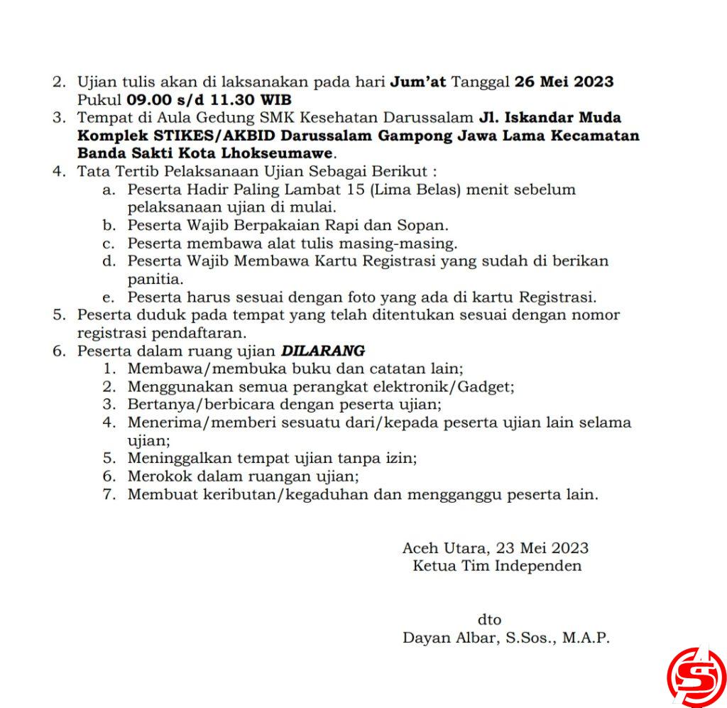 Akhirnya, yang dinyatakan lulus seleksi administrasi 22 peserta dan akan melaksanakan Ujian Tulis pada Jumat, 26 Mei 2023 pukul 09.00 WIB sampai dengan 11.30 WIB. Lokasinya di Aula Gedung SMK Kesehatan Jl. Iskandar Muda Komplek STIKES/AKBID Darussalam Kecamatan Banda Sakti, Kota Lhokseumawe.