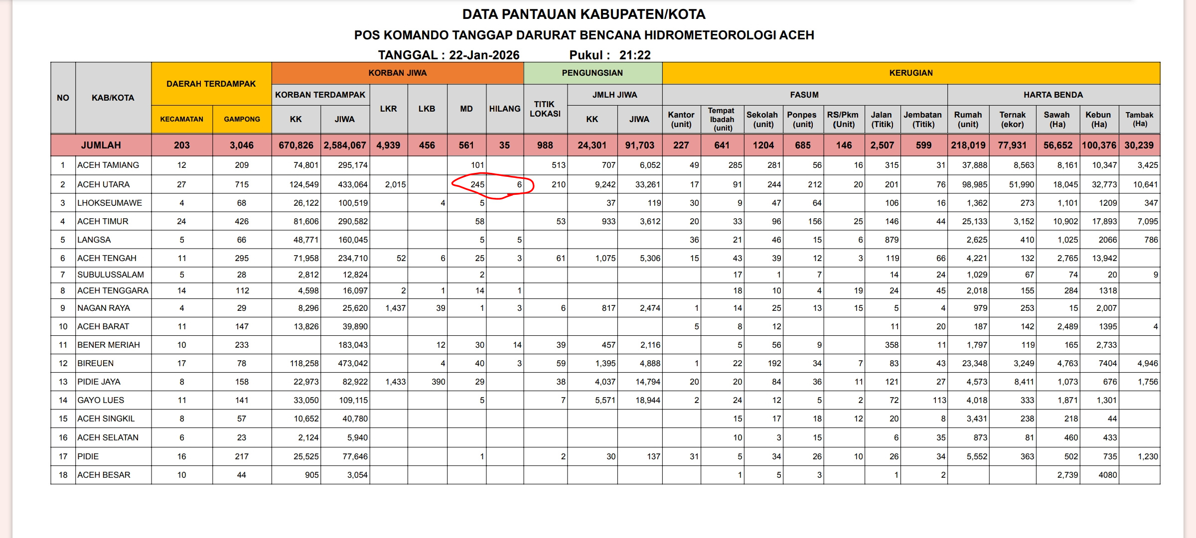 Sebelumnya, data resmi Posko Komando Tanggap Darurat Bencana Hidrometeorologi Aceh per 22 Januari 2026 mencatat 561 orang meninggal dan 35 orang hilang di seluruh Aceh. Korban tersebar di 14 kabupaten/kota, dengan Aceh Utara menjadi wilayah terdampak paling parah, disusul Aceh Tamiang dan Aceh Timur. Rincian korban sementara adalah sebagai berikut: