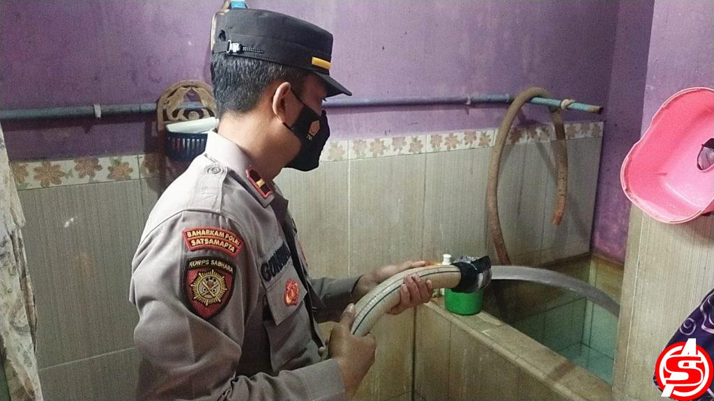 Pantauan di lapangan, sejumlah personel dengan satu unit mobil Tanki sedang mendistribusikan air bersih ke rumah – rumah warga di Gampong Pusong Baru di pantau langsung Wakapolsek Banda Sakti Ipda Gunawan Adi.
