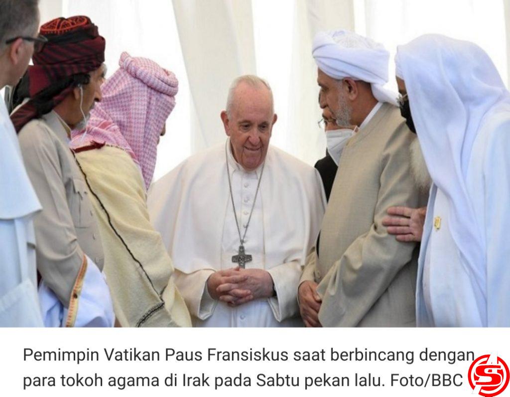 Dia juga bertemu dengan Ayatollah Agung Ali al-Sistani, salah satu ulama paling senior dalam Islam Syiah, di kota suci Najaf di Irak pada Sabtu lalu. Dalam pertemuan itu, Paus menyampaikan pesan bersama tentang hidup berdampingan secara damai.