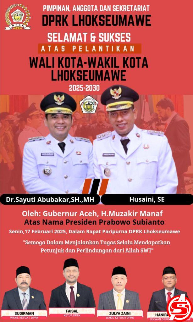 ASPOST.ID-Dr. Sayuti Abubakar, SH., MH., dan Husaini, SE., resmi dilantik sebagai Wali Kota dan Wakil Wali Kota Lhokseumawe periode 2025-2030 oleh Gubernur Aceh,H Muzakir Manaf, atas nama Presiden RI dalam Rapat Paripurna DPRK Lhokseumawe.