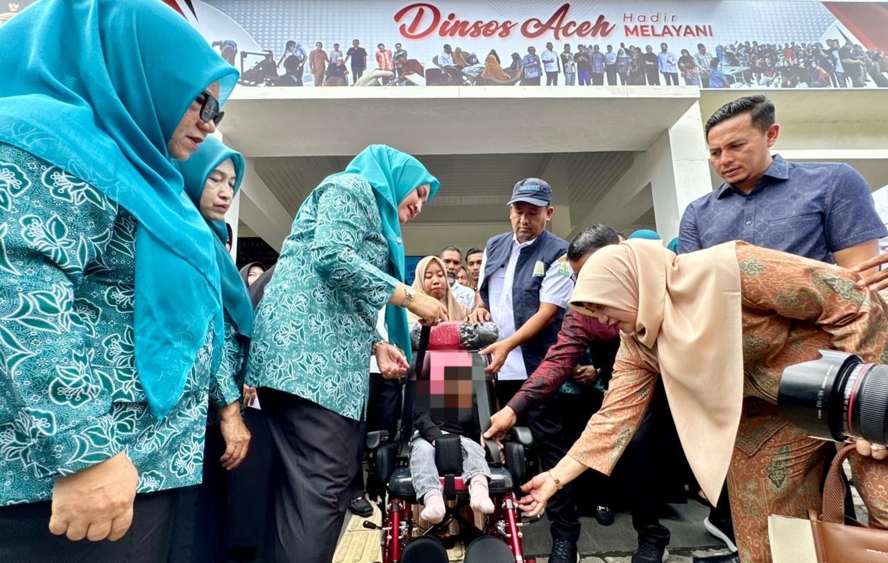 Penyerahan bantuan tahap awal dilakukan secara simbolis oleh Ibu Gubernur Aceh sekaligus Ketua TP PKK Aceh, Ny. Marlina Muzakir, kepada Muhammad Rizki Maulana (3), putra dari pasangan Mahazalena dan Muhammad, di halaman Kantor Dinas Sosial Aceh, Rabu (22/10).