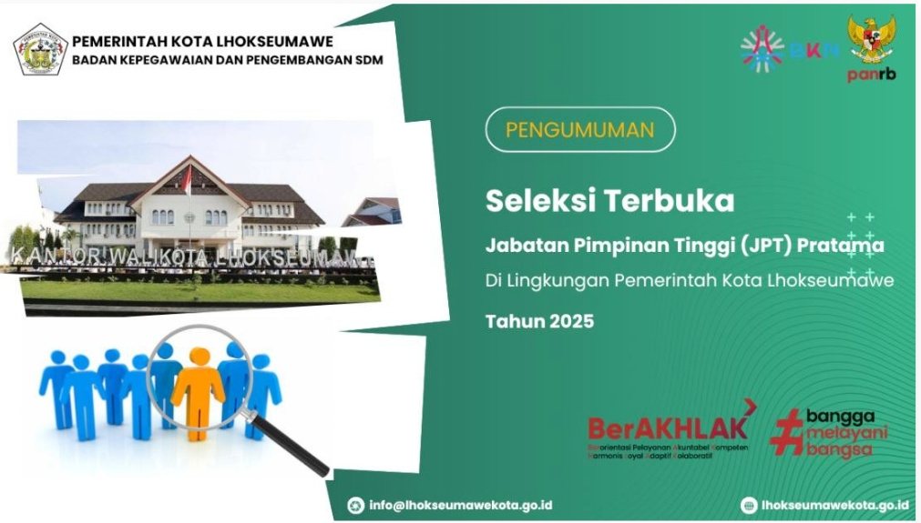 ASPOST.ID- Pemerintah Kota Lhokseumawe resmi membuka seleksi terbuka untuk mengisi 11 posisi Jabatan Pimpinan Tinggi (JPT) Pratama setingkat Kepala Dinas. Pendaftaran seleksi dimulai sejak Kamis, 24 Juli 2025 dan akan ditutup pada 31 Juli 2025 mendatang.