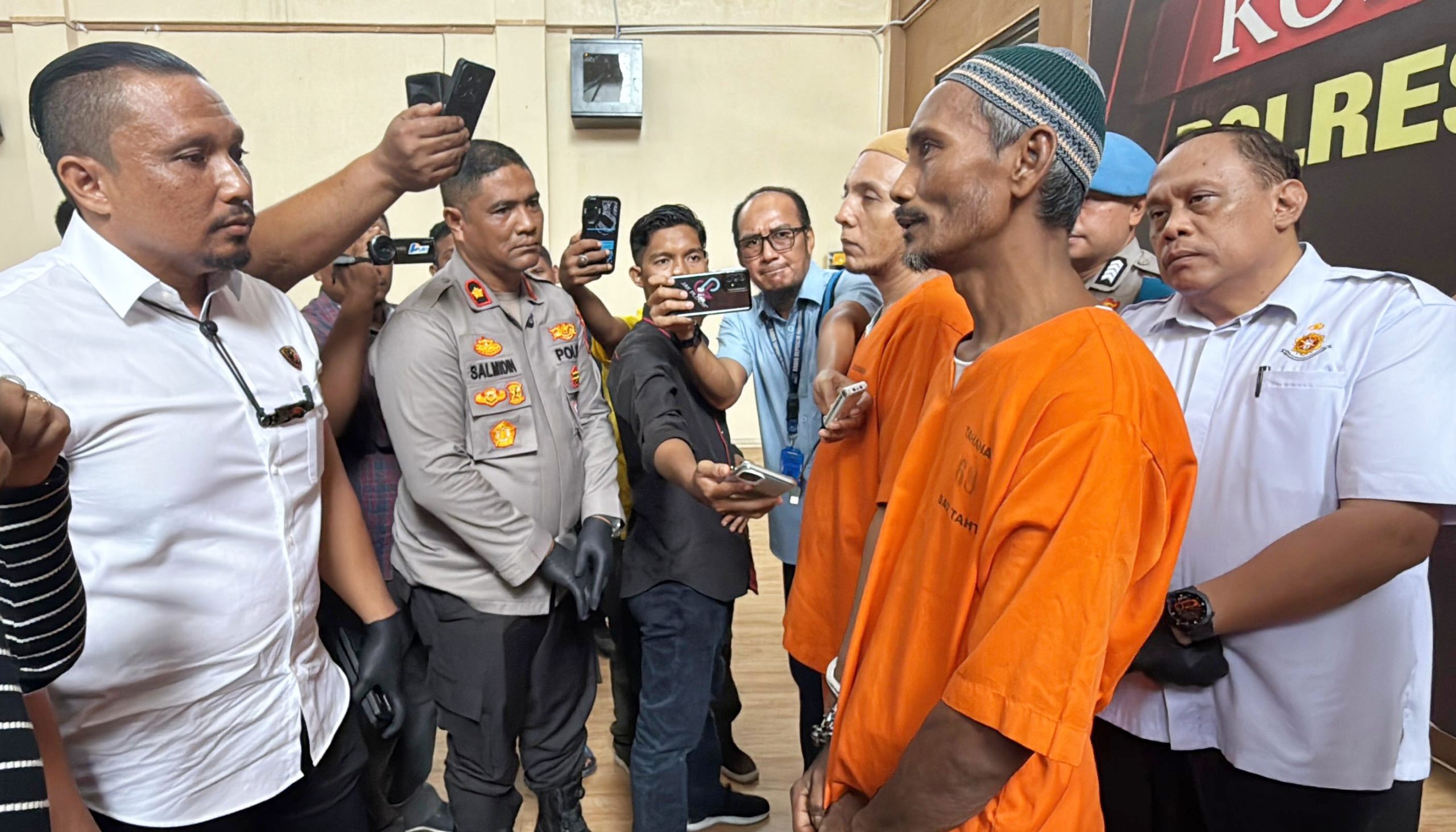 Wakapolres Lhokseumawe Kompol Salmidin, S.E., M.M., dalam konferensi pers yang digelar di Gedung Serbaguna Polres Lhokseumawe pada Rabu (30/7) sore mengungkap identitas para tersangka, masing-masing berinisial EJ (48), warga Kecamatan Baktiya, dan M (41), warga Kecamatan Syamtalira Bayu.