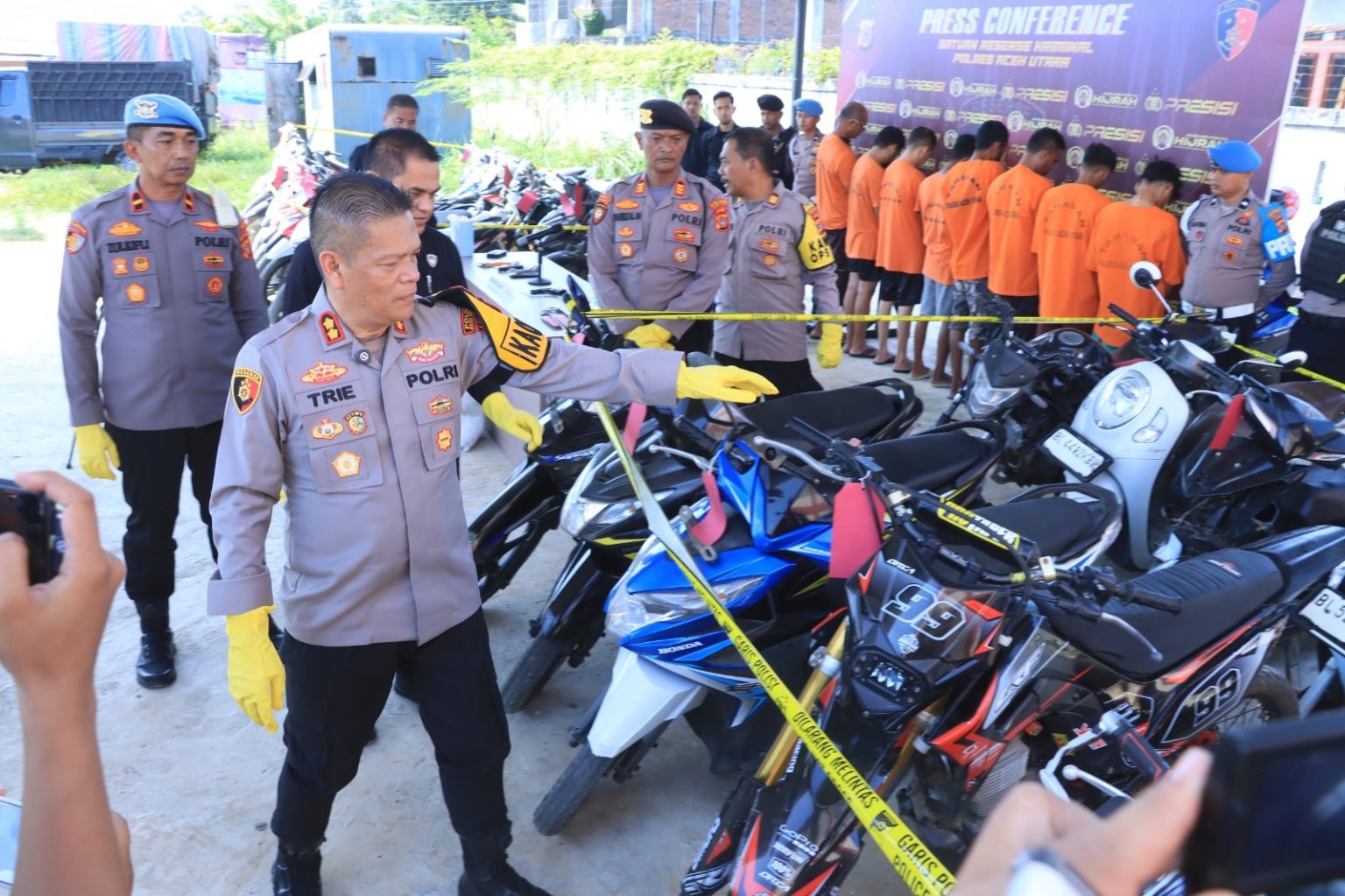 Sebanyak 32 unit sepeda motor dari berbagai merek dan jenis kini diamankan di halaman Mapolres Aceh Utara. Warga yang merasa kehilangan motor diminta datang langsung ke lokasi dengan membawa kelengkapan dokumen seperti STNK dan BPKB untuk proses pencocokan.