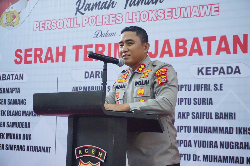 Kapolres Lhokseumawe, AKBP Dr. Ahzan, S.H., S.I.K., M.S.M., M.H., dalam sambutannya mengapresiasi dedikasi para pejabat lama serta menyambut kehadiran pejabat baru dengan penuh optimisme.