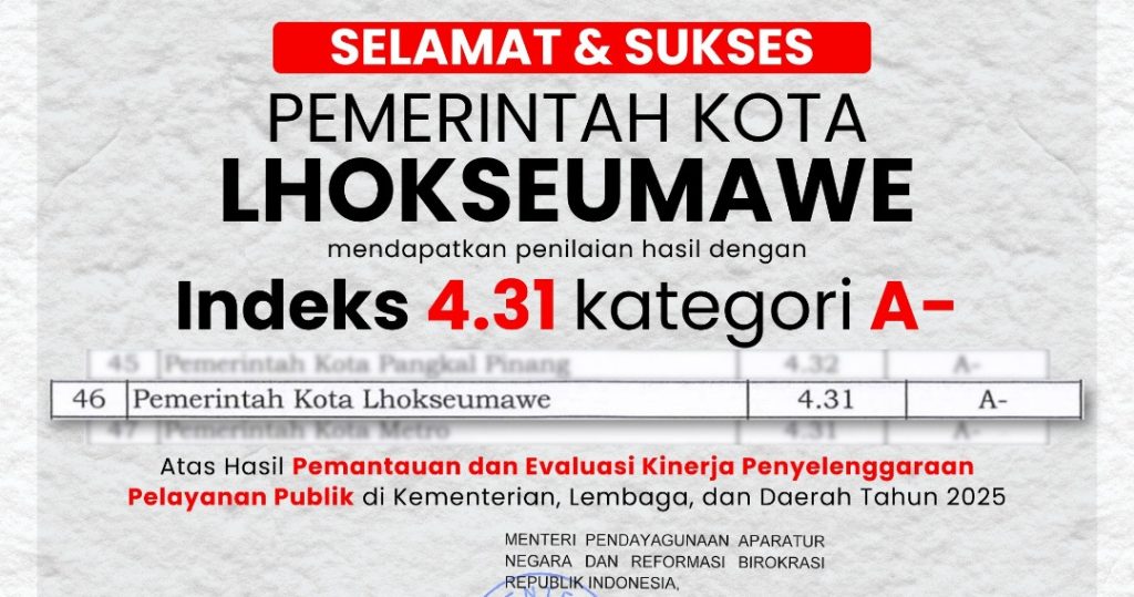 ASPOST.ID- Pemerintah Kota Lhokseumawe kembali mencatatkan prestasi membanggakan di tingkat nasional. Berdasarkan hasil Pemantauan dan Evaluasi Kinerja Penyelenggaraan Pelayanan Publik di Kementerian, Lembaga dan Daerah Tahun 2025, Pemko Lhokseumawe meraih nilai indeks 4,31 dan masuk dalam kategori A-.