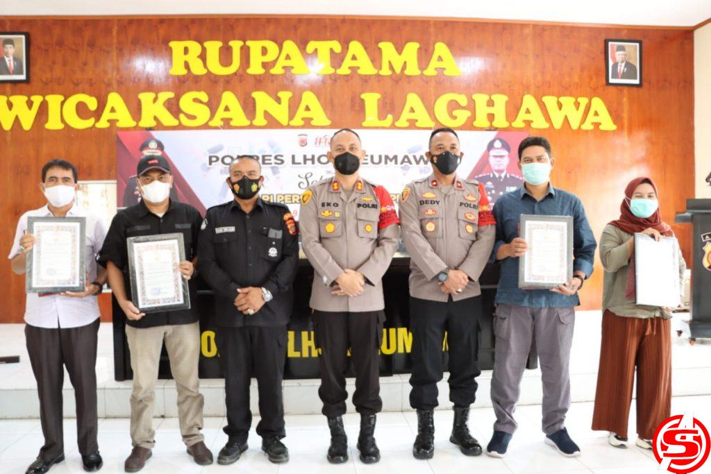 Piagam penghargaan itu langsung diberikan oleh Kapolres yang didampingi Wakapolres Kompol Dedy Darwinsyah,SE.,MM kepada PWI yang diterima oleh Bendahara PWI, Drs.Marzuki, M.Si. Dan untuk Persatuan Wartawan Aceh diterima oleh Armiadi AM,SE selaku Ketua Harian PWA Pusat.