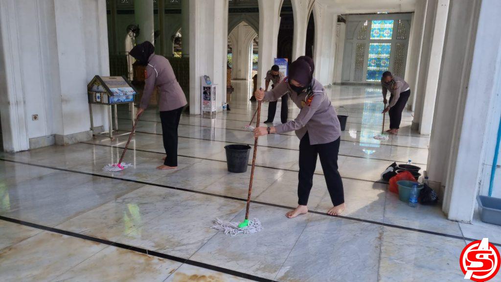 Kasat Lantas AKP Adek Taufik bersama personel Satlantas langsung turun membersihkan tiga lokasi paska terendam banjir dalam sepekan terakhir ini.